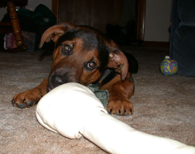 Now our friend Brent is on his way over with his Rottweiler. He said last night that it weighs 45 pounds now and is about knee high. Poor Dozer doesn't stand a chance anymore. Speaking of Dozer, check out the surprise he got in the mail today from his friends Faith and Boris in New York. Todd thinks it's a femur from a T.Rex.